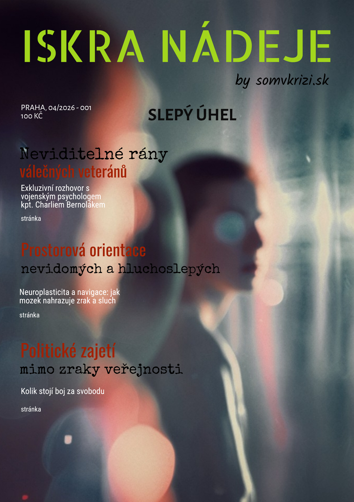Popis obrázku: Na obrázku je obal budoucího prvního vydání časopisu Iskra nádeje. Tématem časopisu je "slepý úhel". Hlavními články budou